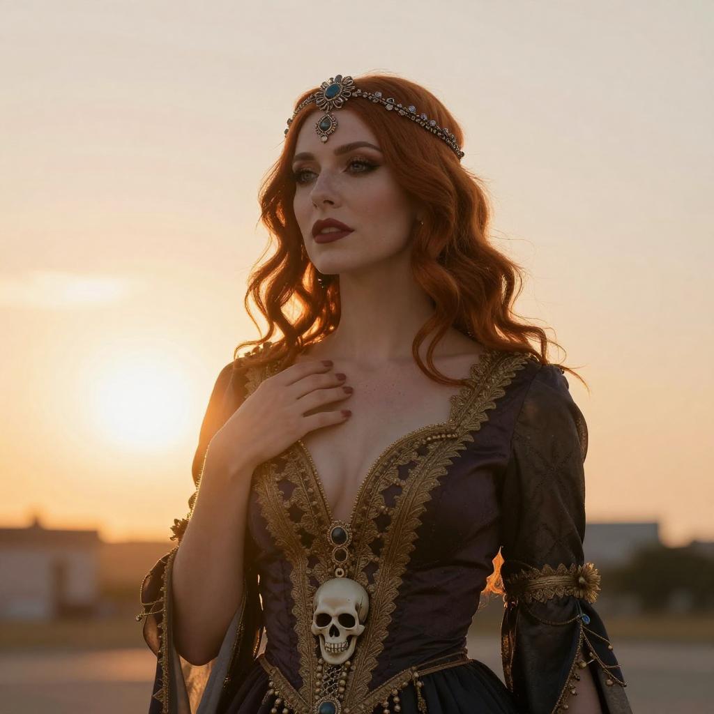 Photograph of a woman with red hair, wearing a dark, ornate dress with a deep V-neck and a skull brooch, standing in front of a bright sunset. Her hand touches her chest, and a jeweled headpiece adorns her hair. The sun's glow highlights her silhouette, casting warm, golden light.