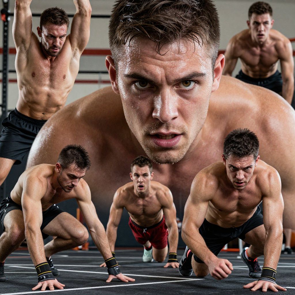 Photograph of a muscular, shirtless man with short brown hair in the center, focusing intensely on the camera. Surrounding him are six other muscular men, also shirtless and wearing black shorts and wristbands, performing various intense workout poses in a gym. The background includes gym equipment and a red-and-black weight rack. The image uses dramatic lighting, highlighting the men's defined muscles and sweat, creating a powerful, motivational atmosphere. The central man's face is enlarged and prominent, emphasizing determination and focus.