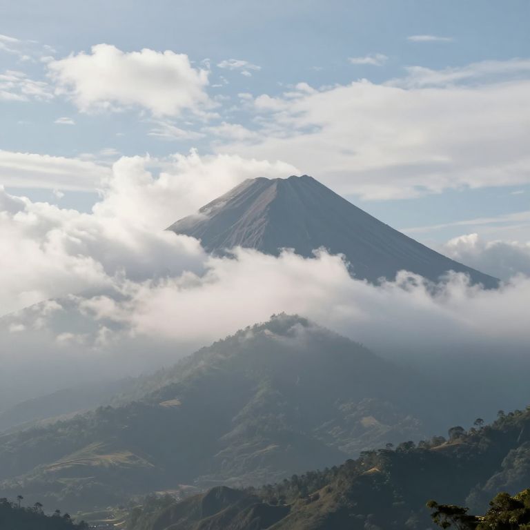 Mountainous landscape dominated by a towering volcano shrouded in billowing white clouds, its peak piercing through a serene sky dotted with scattered cumulus formations, while misty valleys below hint at the earth's rhythmic breath.