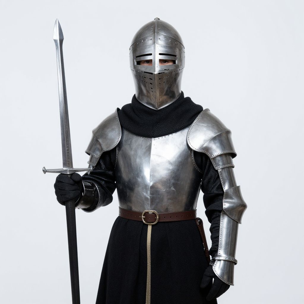 Photograph of a medieval knight's back, showing a silver sword with a diamond-shaped pommel, black leather belt, and white sleeves with black