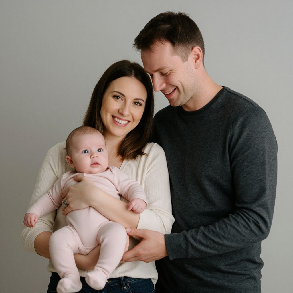 Photograph of a smiling Caucasian couple with dark hair, holding a baby in pink clothes, against a plain gray background. Father wears dark sweater, mother