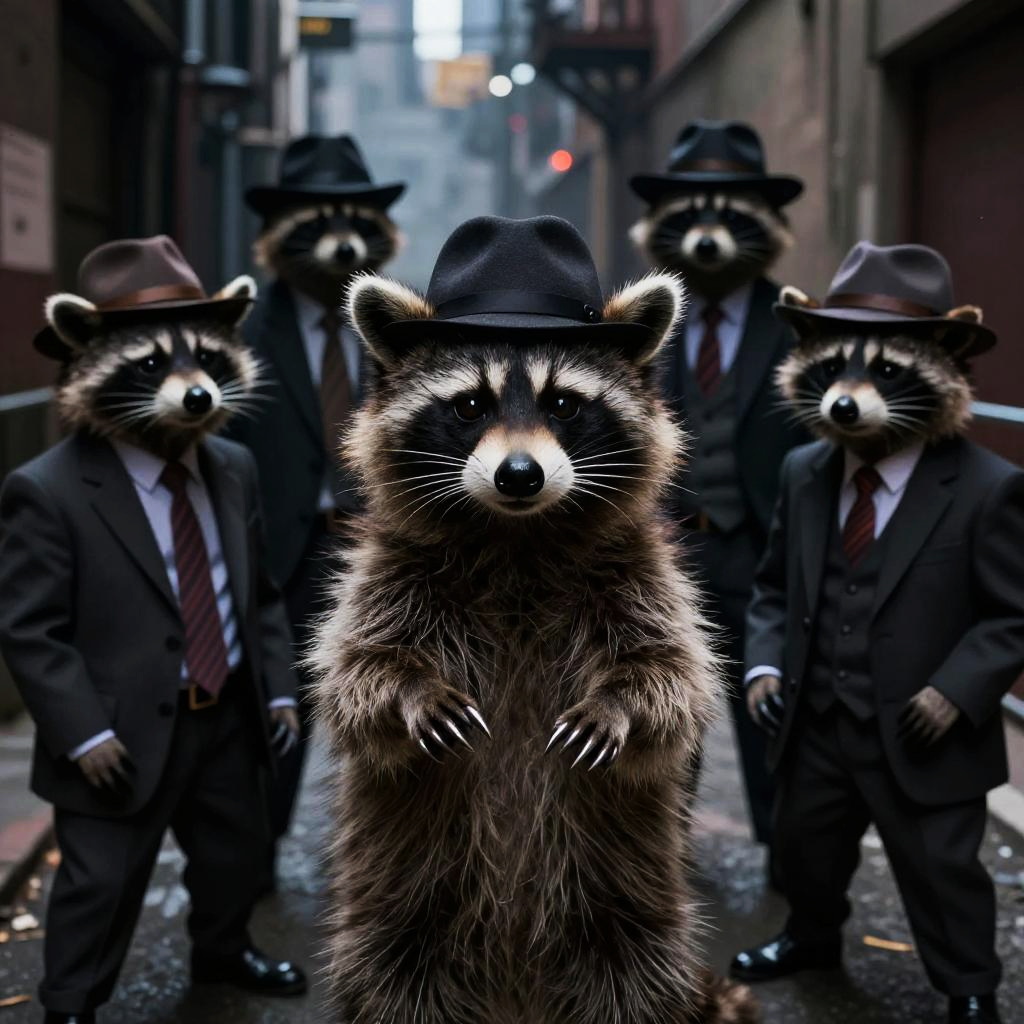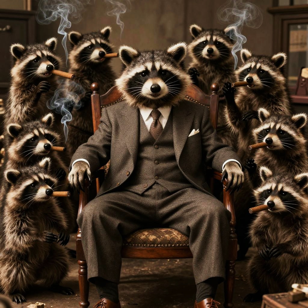 A raccoon mafia family portrait in a grandiose manor, raccoons dressed in fine 1920s gangster attire, opulent surroundings with chandeliers and antique furniture, rich color palette, detailed facial expressions showing cunning and loyalty