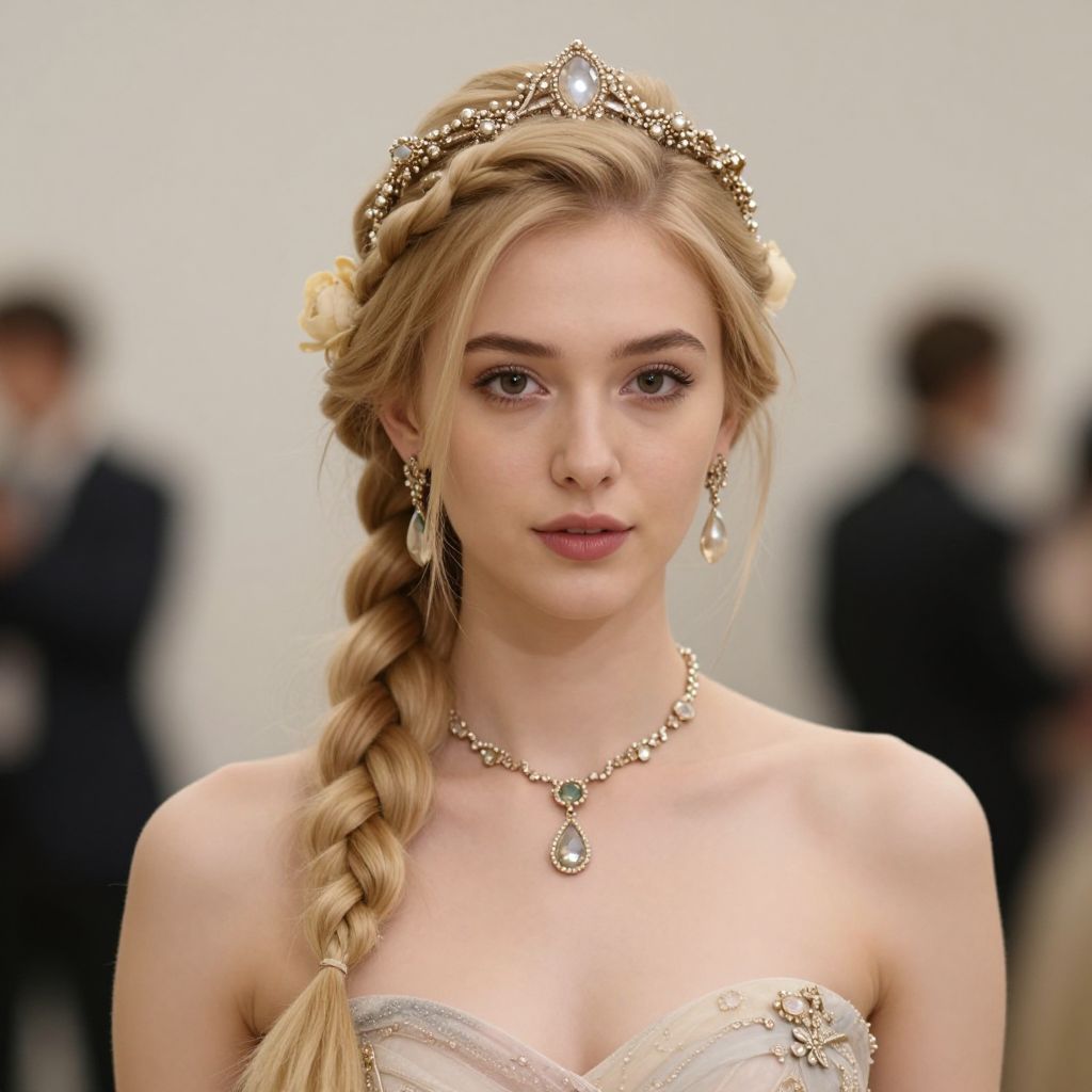 Photograph of a young, fair-skinned woman with long, blonde hair styled in a braided crown, adorned with a gold tiara featuring a central gem. She wears a strapless, white, lace gown with intricate embroidery and a silver pendant necklace. Her makeup is subtle, with natural tones and lightly defined eyebrows. She has small, gold, teardrop earrings. The blurred background shows indistinct, dark-clad figures, suggesting a formal event or photoshoot. The lighting is soft, highlighting her delicate features and elegant attire.