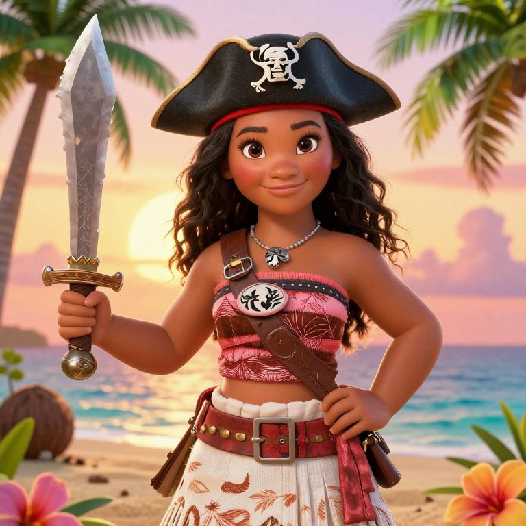High-definition photograph of Moana dressed as a coconut pirate, wearing a full pirate outfit with a carved coconut emblem on her chest, standing on a pirate-themed island with palm trees and tropical flowers, the sun setting behind her, her face has soft, bright features, light brown skin, and a confident smirk, holding a wooden sword with a coconut hilt.