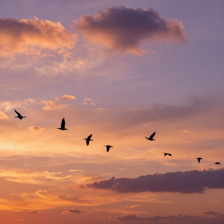 A flock of oiseaux flying in formation across a vast sunset sky, warm orange and purple hues blending seamlessly, dynamic and energetic movement, dramatic clouds, wide panoramic view, impressionistic artistic style