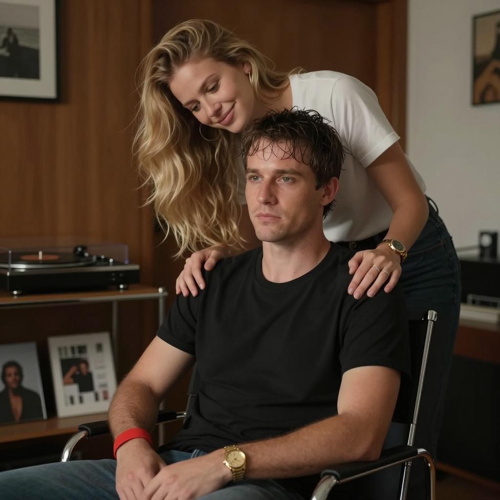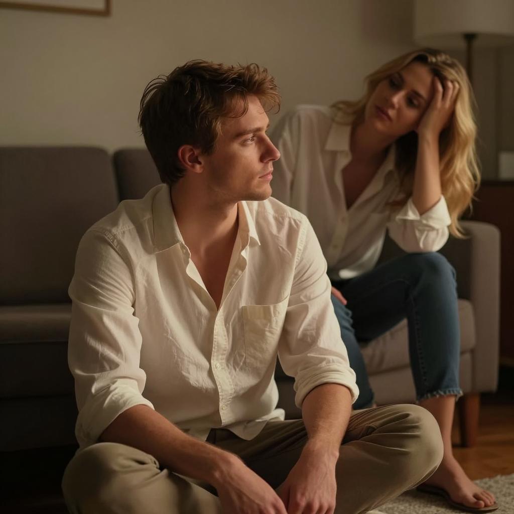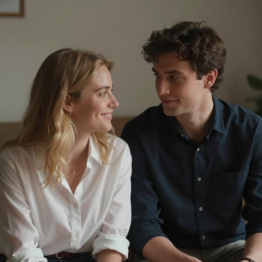 Two people in a dimly lit room. A man with short brown hair, shirt open, sitting with legs apart, focused expression. A woman with blonde hair, wearing a white shirt, leaning back with hand on face. Warm lighting, soft shadows. Background furniture blurred. Man's chest exposed. Woman's shirt slightly wrinkled. Both looking at each other intently.