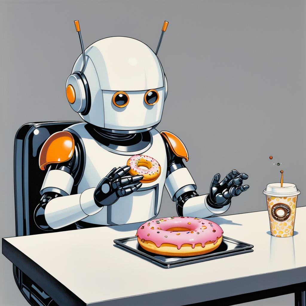 A lithograph-style image of an anthropomorphic retro robot with shiny metallic surface and orange eyes, holding a pink frosted donut. The robot is seated at a white table with multiple frosted donuts in various colors placed on small plates.