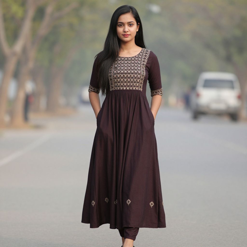 "red long churidar, 1girl, solo, long hair, black hair, dress, standing, looking at viewer, outdoors, realistic, flower Realistic photo of casual sexy person with pretty face"
