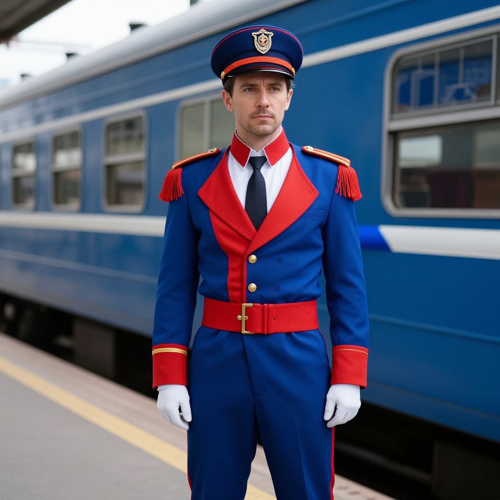 Photograph of a handsome Caucasian male train conductor standing on a platform. He wears a formal navy blue uniform with red accents, including red epaulettes, red trim, and a red belt, paired with a white shirt and black tie. He has a clean-shaven face, light brown hair, and is wearing a navy blue hat with a silver emblem. He also wears white gloves. Behind him is a blue train with white stripes. The platform has yellow safety lines and the background is slightly blurred, focusing on the conductor. The lighting is bright, indicating daytime.