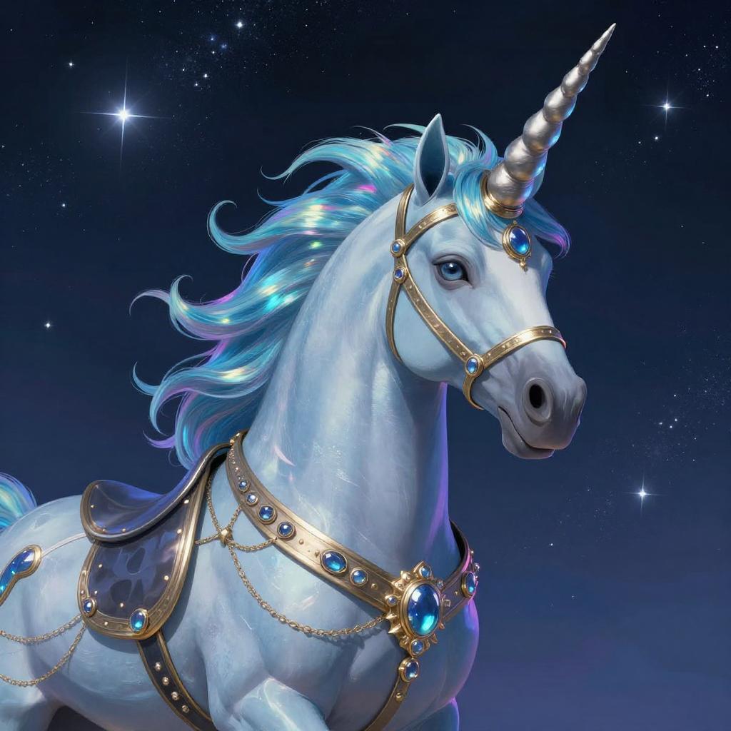 Digital illustration of a futuristic blue unicorn with two spiraled horns, adorned with ornate golden and jewel-encrusted harness. The unicorn is depicted against a cosmic night sky filled with stars, with vibrant neon colors highlighting its flowing mane and metallic features.