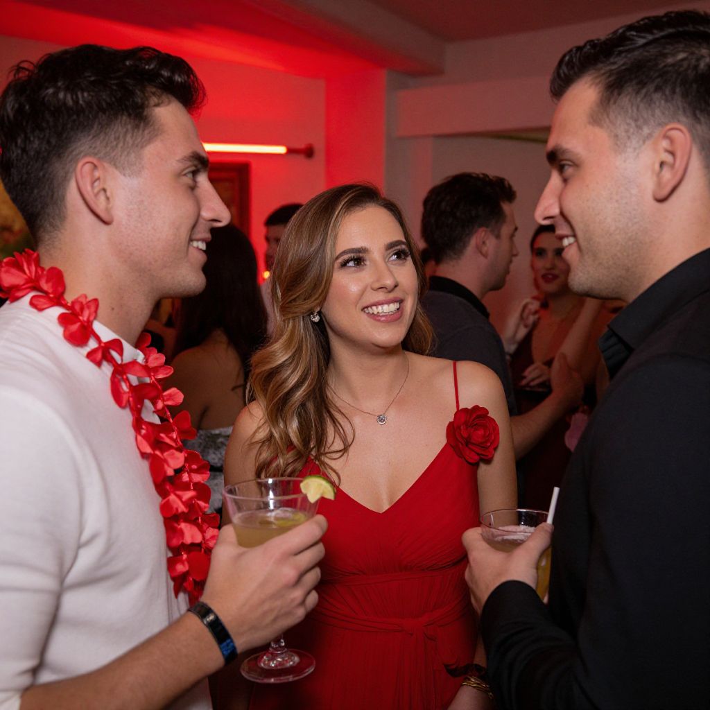 Vibrant red lights illuminate a lively hen party scene where three guests—two men and one woman—are engaged in joyful conversation, with the central woman wearing a striking red dress adorned with a flower accessory and a delicate necklace, while the man to her left holds a cocktail glass and wears a red lei around his neck.
