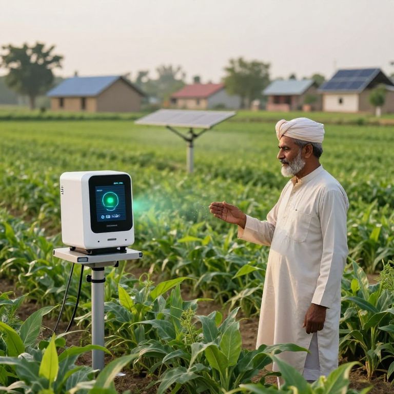 A futuristic panjabi prompt blending traditional Punjabi elements with modern architecture — a smart village with solar panels, local art, and digital signage displaying Panjabi poetry, echoing cultural continuity.