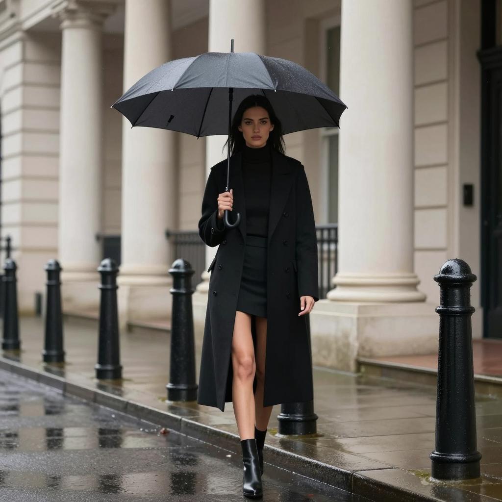 Stylish woman with short black hair wearing a vibrant red fur coat over a black mini dress with a high slit. She pairs the outfit with black knee-high boots and holds a transparent umbrella. The woman stands with one leg raised, looking to the side with bold red lipstick. Photo taken outdoors in front of wooden garage doors on a gray concrete surface under an overhang roof.
