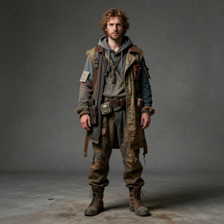 Photograph of a white man with wavy brown hair and a beard, standing against a dark gray studio backdrop. He wears a rugged, layered outfit consisting of a gray hoodie, a long brown leather vest with multiple straps and pockets, and olive-green cargo pants with patches. His brown boots are laced up, and he has several leather and metal accessories, including a belt with a silver buckle and a pouch. His expression is neutral, and he stands with his arms slightly relaxed at his sides. The lighting is soft, highlighting the textures of his clothing and accessories.