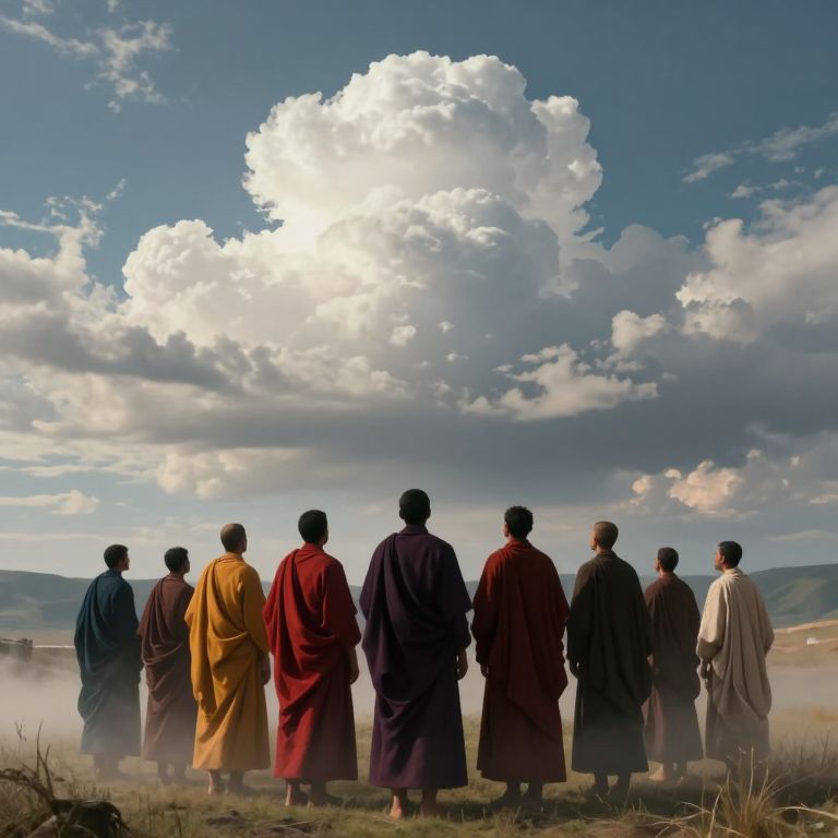 A group of individuals draped in colorful robes stand in a hazy field, gazing upward at a dramatic sky filled with voluminous, billowing clouds, evoking a sense of awe and contemplation reminiscent of classical religious or spiritual imagery, rendered in a high-definition, digital art style.