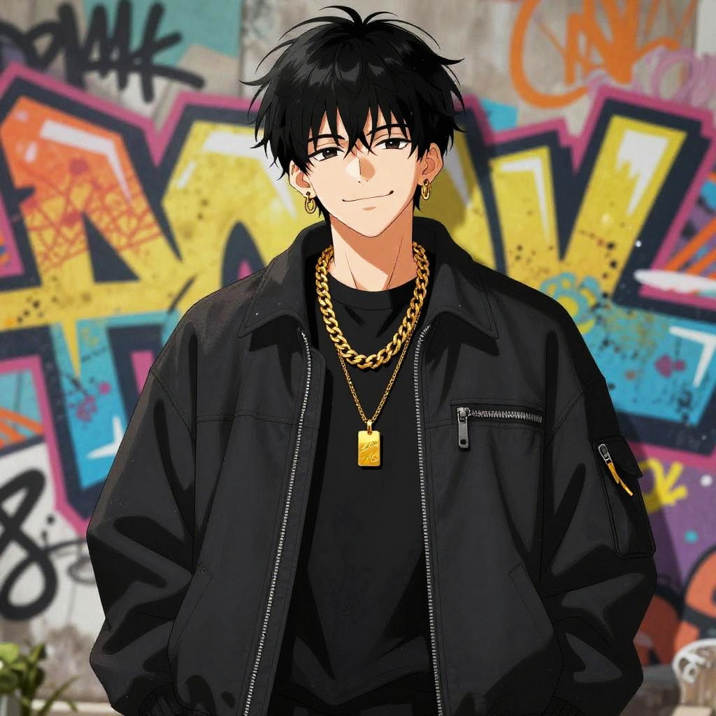 Anime crossed arms confident male protagonist, urban streetwear, graffiti backdrop, bold expression, dynamic shading, neon lights, stylized cityscape, cinematic vibe