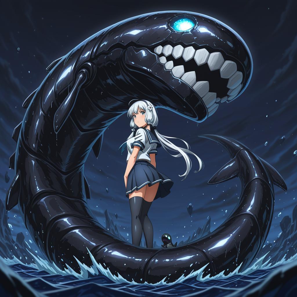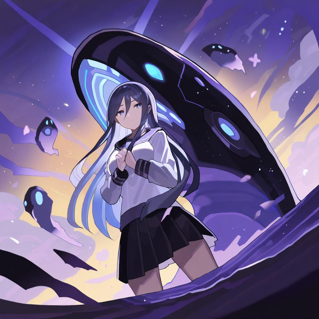 Digital artwork featuring an anime-style girl with long dark hair and blue eyes, wearing a traditional Japanese sailor school uniform (serafuku). She stands in front of a large futuristic ha-class destroyer ship with glowing blue accents, surrounded by a surreal purple and yellow sky with floating abstract shapes and objects. The style is detailed, colorful, and inspired by the Kantai Collection theme.