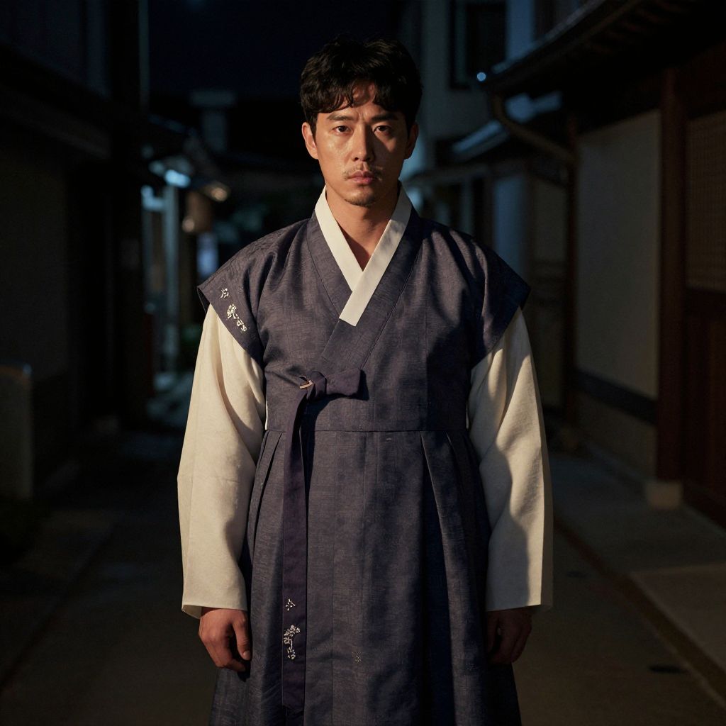 Photograph of a serious East Asian man in traditional Korean hanbok, standing in a dimly lit, narrow alley at night.