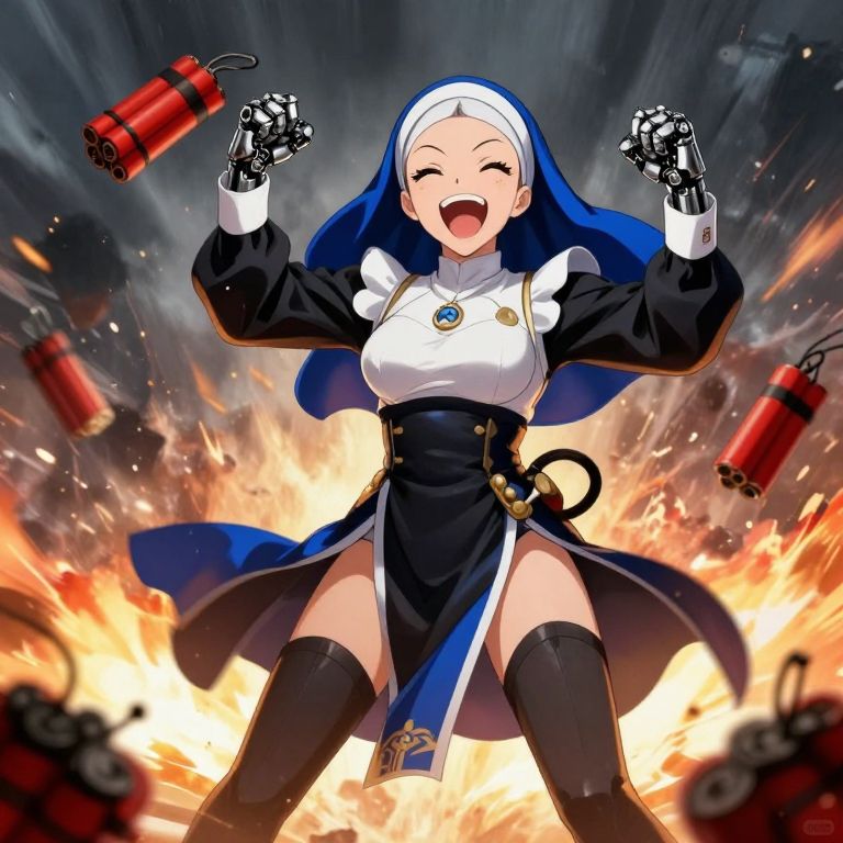 This digital anime-style illustration depicts a jubilant, young, fair-skinned nun with long, dark blue and white habit, black gloves, and thigh-high black boots. She has large breasts and a confident smile, eyes closed in joy. She's dressed in a black and white outfit with a gold pendant, and her arms are raised with fists clenched. Explosive red bombs with black wires surround her, set against a backdrop of fiery explosions. The dynamic background creates a sense of intense action, contrasting with her joyful expression. The art style is vibrant and energetic, with sharp lines and bright colors.