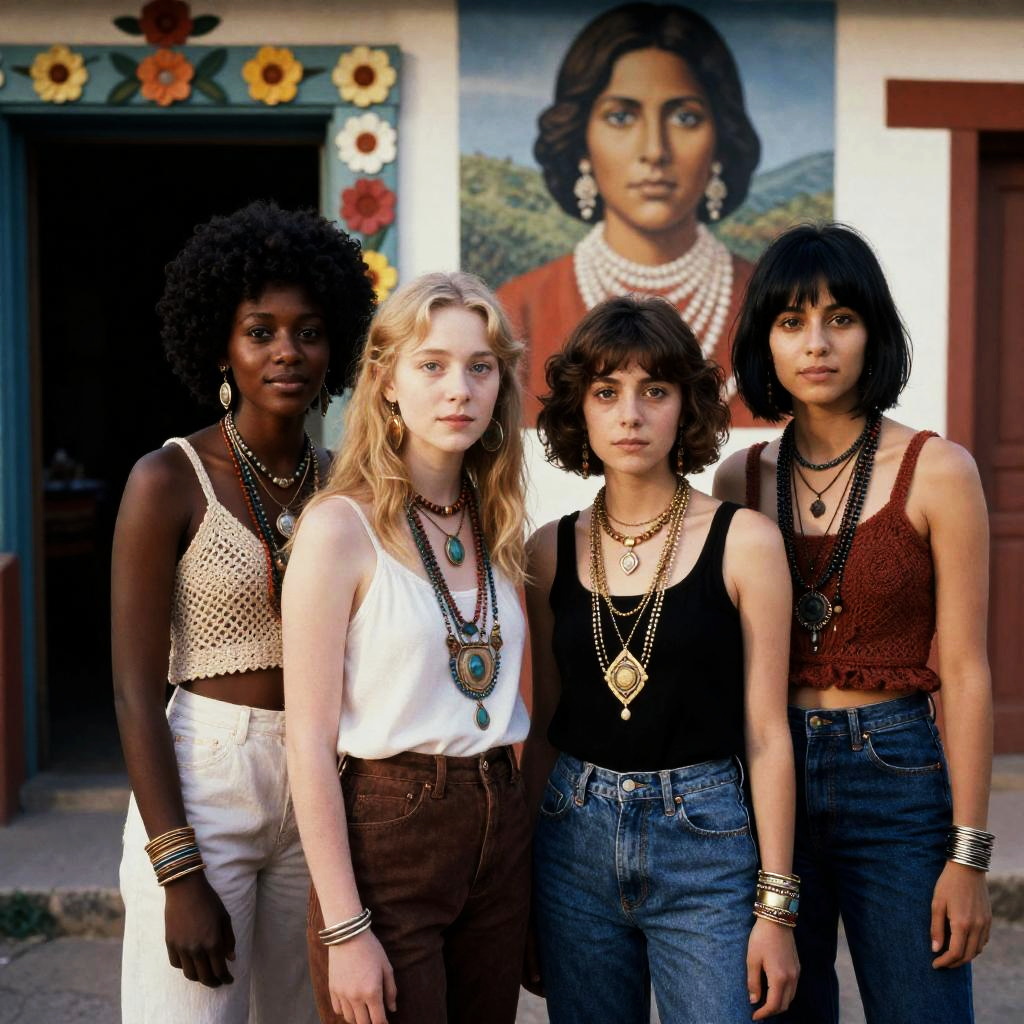 Realistic photo.A 1980s fashion professional candid feminist street photograph taken by Mary Ellen Mark and Bruce Davidson and Diane Arbus and Josef Koudelka with an very wide lens - high detailed shot with colour Kodachrome medium format film and flash, fine grain and sharp film, sunrise light chiaroscuro, cute rural portrait of three or four or five people mixed races and genders - asian african european latina, epic, iconic lookalikes of Phoebe Bridgers and Saoirse Ronan and Audrey Tautou and PJ Harvey, wearing bohemian layered jewellery and hypermaximalist portrait, colourful south american village exterior or a wide metropolitan avenue with folklore details, decorated with flowers and huge famous paintings, diamond and metallic accessories, wedding atmosphere, attractive and cute hipster fashion with embroidered or crochet details, no hands visible, traditional vogue modern hairstyle, attractive and fashionable and professionally posing models, insanely detailed and photorealistic faces, f2 bokeh, peacefully and curiously looking at me, hypermaximalist portrait, elegant and appealing. realistic photo