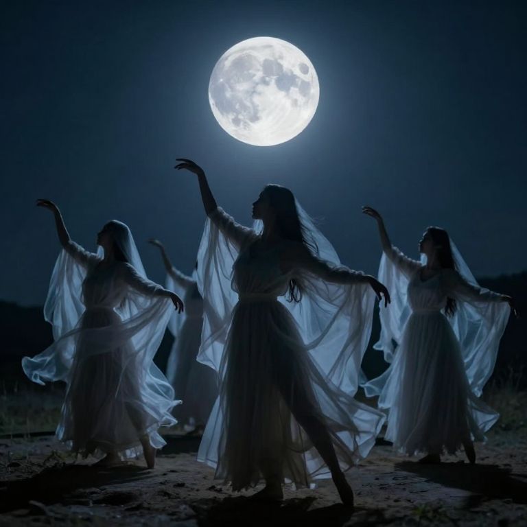 Photograph of four silhouetted women dancing under a full moon. They wear flowing, translucent white dresses with long sleeves and veils. Their arms are raised gracefully, creating an ethereal, ghostly effect. The bright, luminous moon dominates the dark, starless night sky, casting a bluish glow on the women's figures. The ground is sandy, and the women's dresses billow slightly as they move. The overall scene evokes a mystical, haunting atmosphere, with the moonlight emphasizing their ghostly forms and the delicate textures of their dresses.