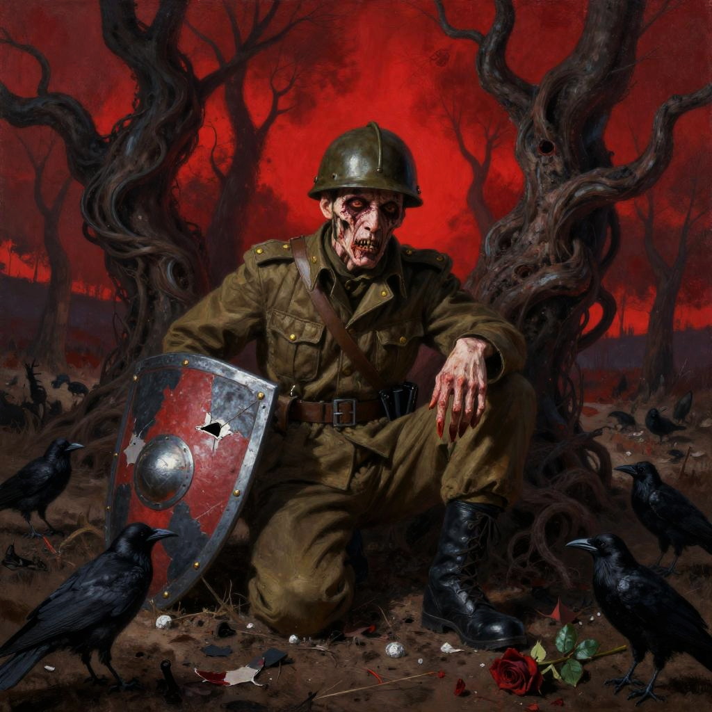 Realistic photo.A grotesque surreal masterpiece painting in the style of James Gurney, a dying soldier surrounded by twisted trees, in a desolate battlefield under a blood-red sky, a shattered shield, crows, and a withered rose. realistic photo