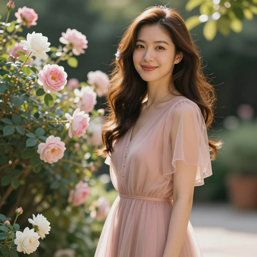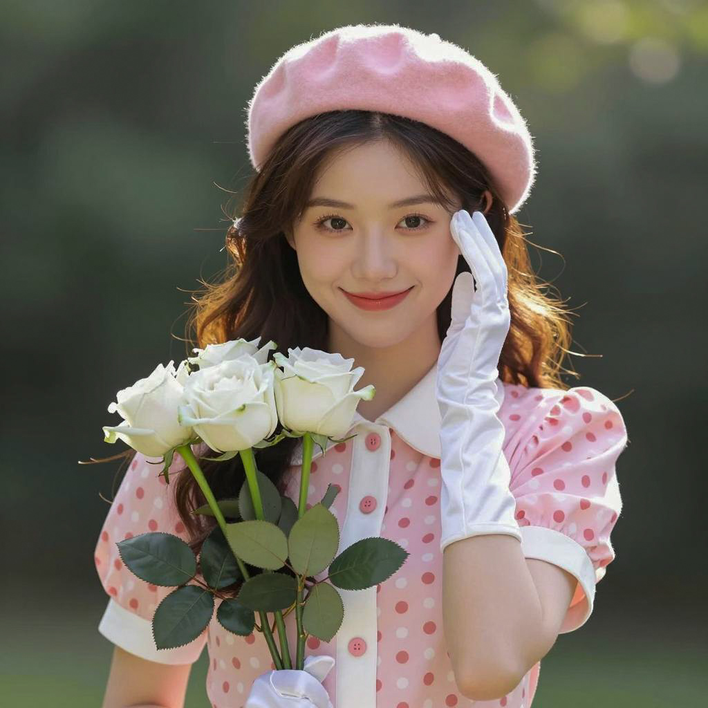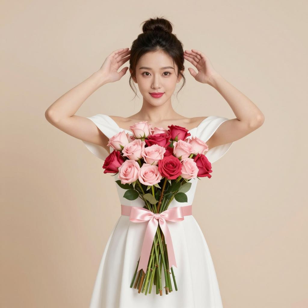 Asian woman with fair skin, dark hair in a bun, pink lipstick, wearing an off-shoulder white dress. Arms raised, hands near head. Large bouquet of pink and red flowers with green stems and a pink ribbon tied around the middle. Plain beige background. Centered, front-facing.