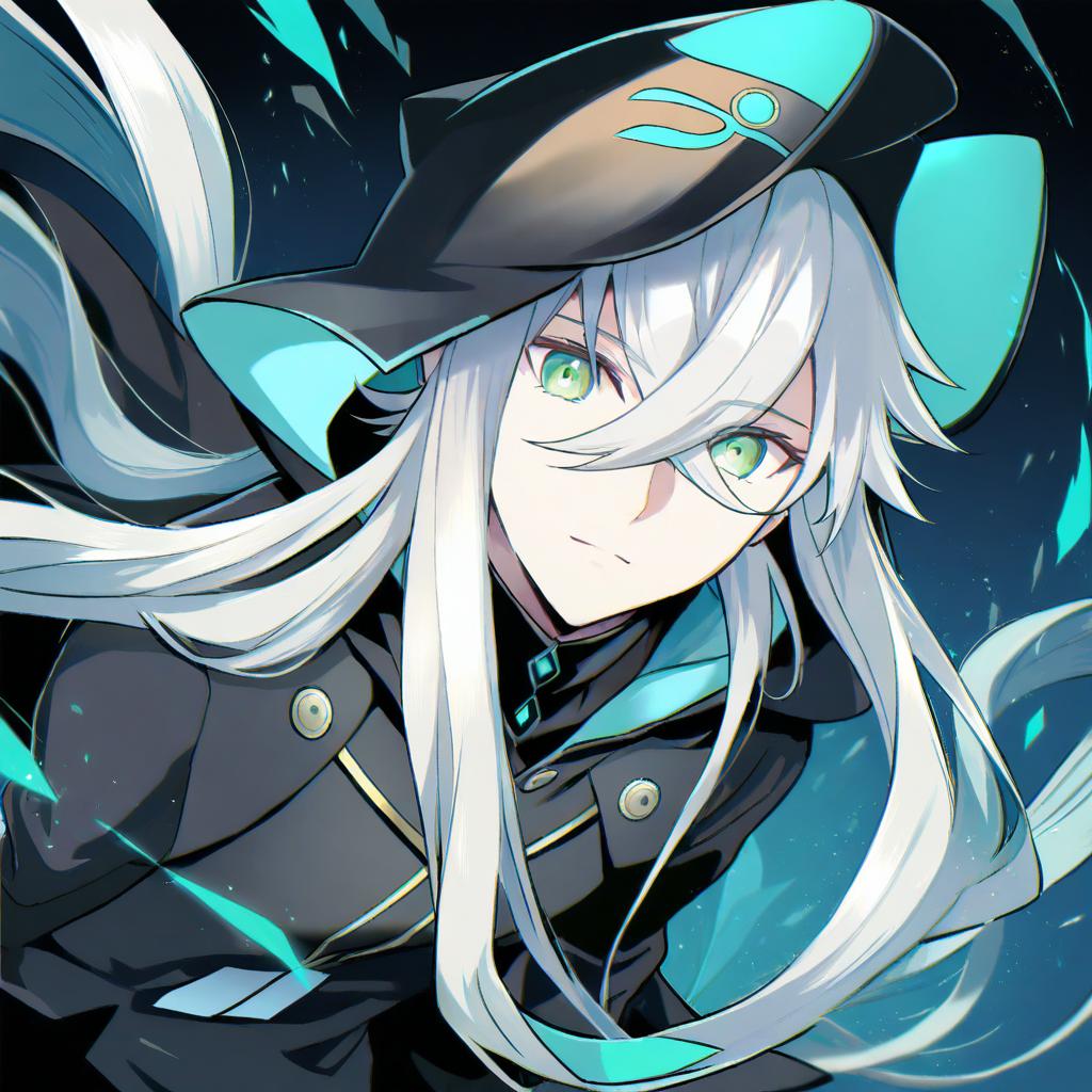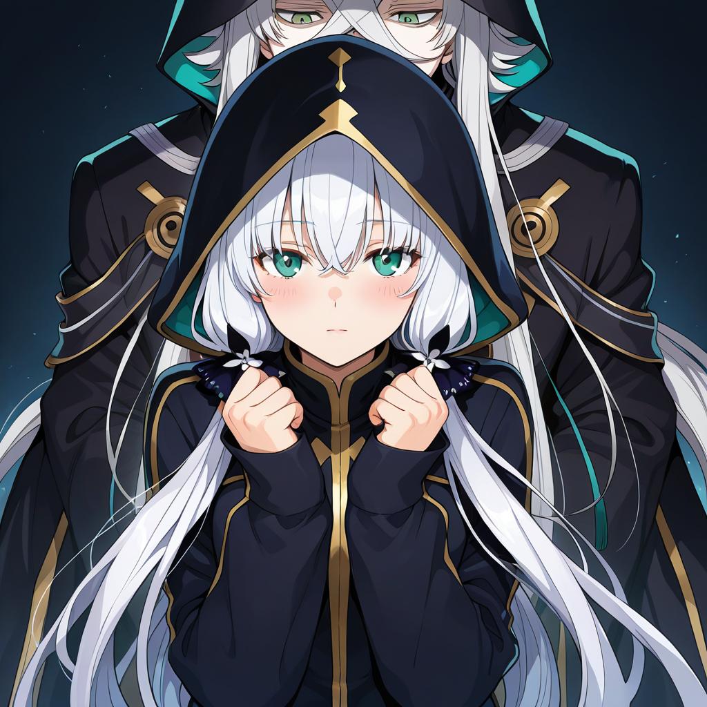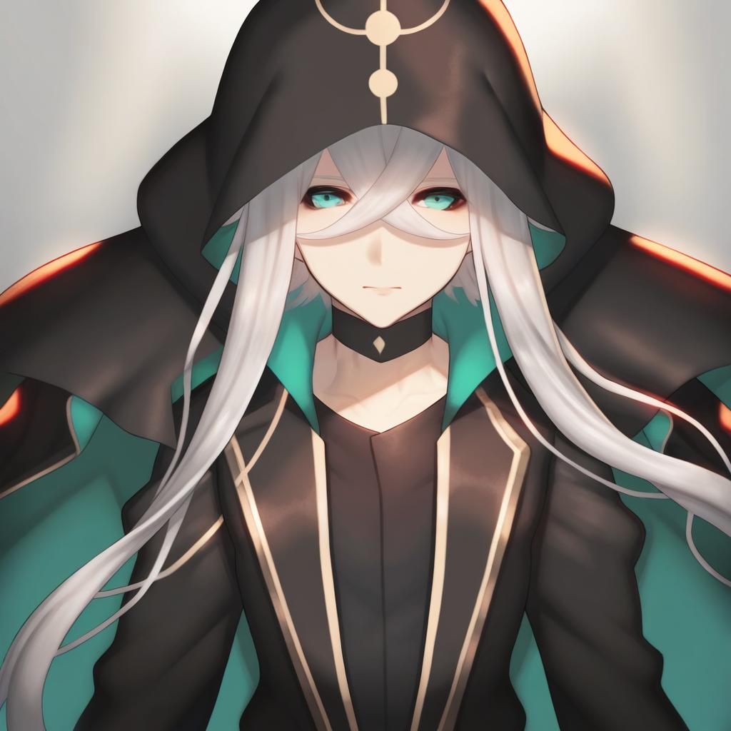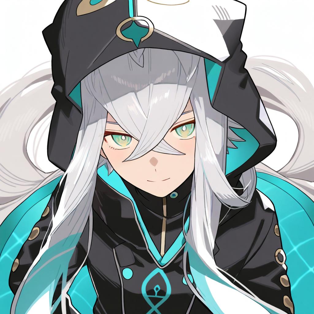 Asclepius (fate), fate (series), 1boy, hair between eyes, green eyes, white hair, long hair, very long hair, grey hair, crossed bangs, black jacket, long sleeves, hood up, by artist medu (rubish), illustrious