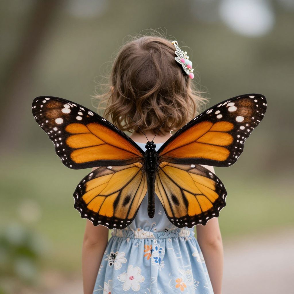 Girl toddler monarch, 1girl, solo, insect wings, butterfly wings, wings, dress, bug, blurry background, fairy, brown hair, butterfly, blurry, hair ornament