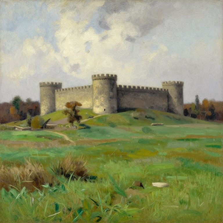 Charcoal Drawing a large green pasture landscape by day, large old stone castel in the background, isaac levitan + william turner style, oil painting,