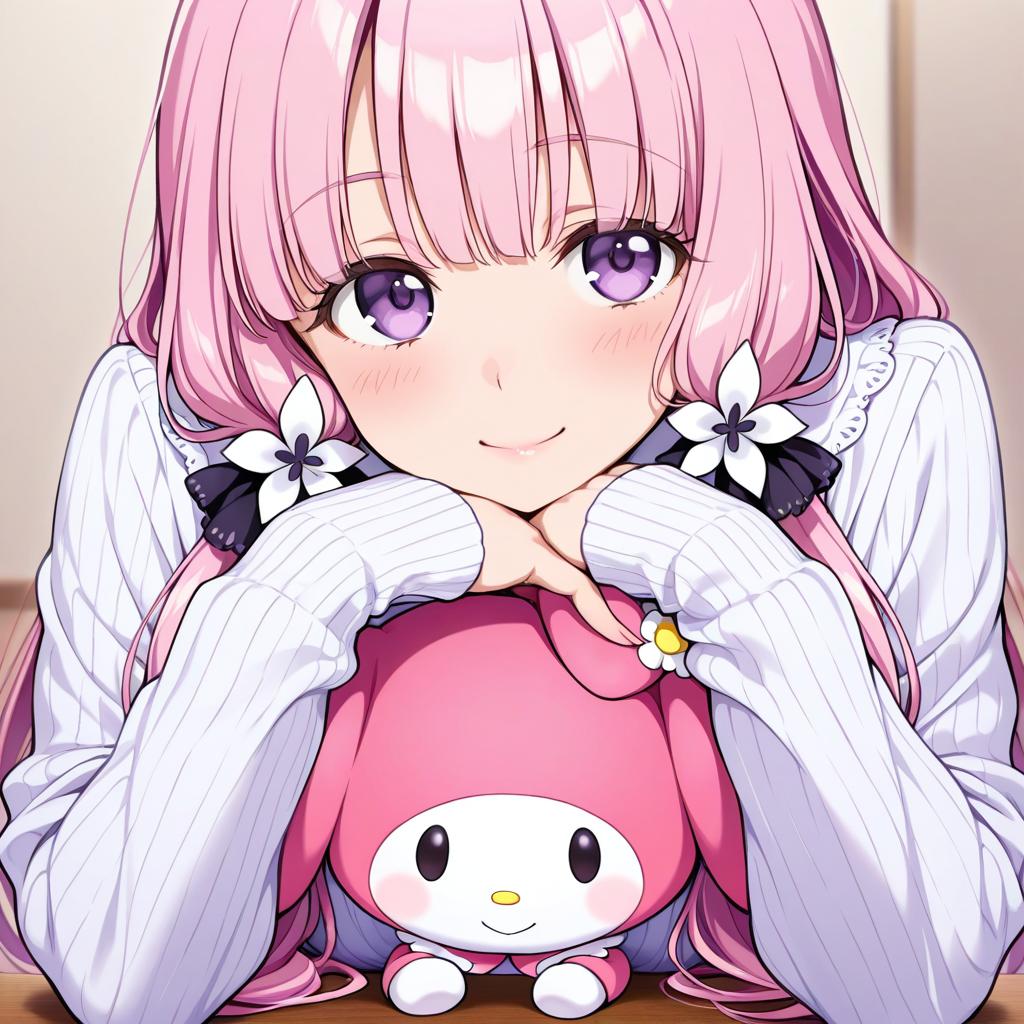 My melody, sanrio, 1girl, pink eyes, long hair, pink hair, long sleeves, by artist hiyori (rindou66), illustrious