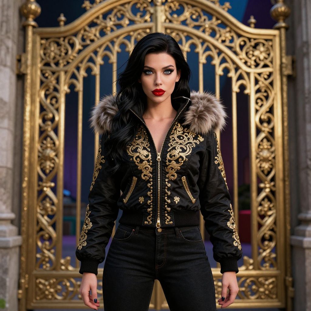 This is a digital CGI image of a striking woman standing in front of an ornate, gold, wrought-iron gate. She has long, black wavy hair, pale skin, and bold red lipstick. She wears a black jacket with intricate gold embroidery and a fur-trimmed hood, paired with black jeans. Her intense blue eyes are accentuated with dark makeup. The gate behind her features elaborate, symmetrical patterns and is set between stone pillars. The background is slightly blurred, highlighting the detailed textures of the gate and her stylish attire. The overall composition emphasizes her confident, fierce demeanor.