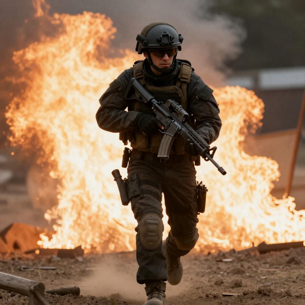 A heavily armored soldier with a helmet and tactical gear runs forward, gripping a large assault rifle in each hand. Bright, intense flames fill the background, creating a dramatic contrast with the soldier's dark, rugged attire. The ground beneath him is dusty and uneven. The soldier's determined expression is visible through the helmet's visor.