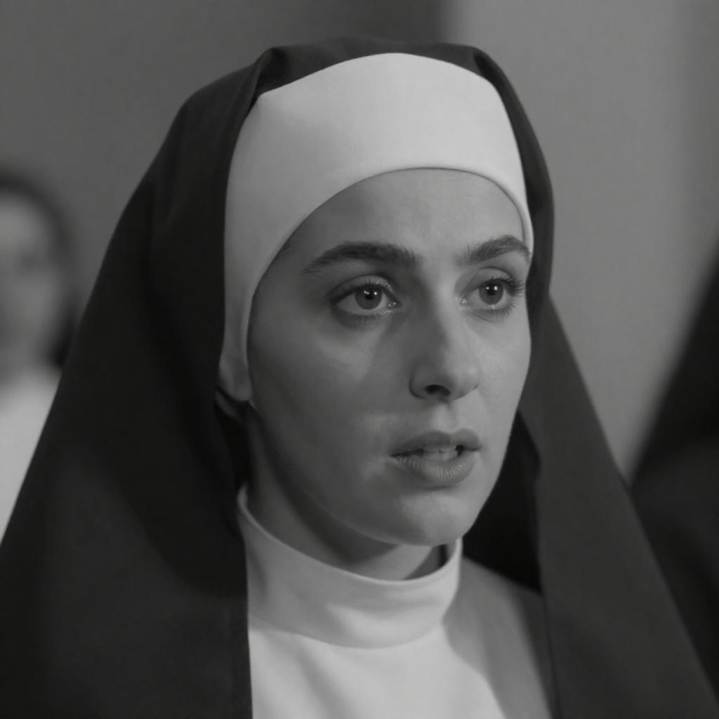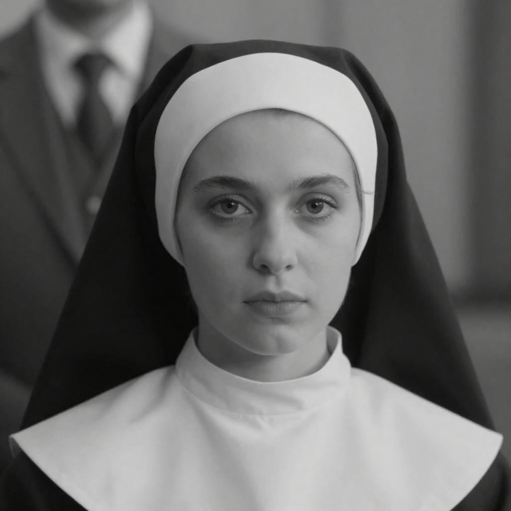 Sepia-toned photograph of two women. Nun on left with dark habit and white collar, profile facing right. Woman on right with light hat adorned with flowers, intense gaze, dark coat, standing next to wooden door. Both facing each other.