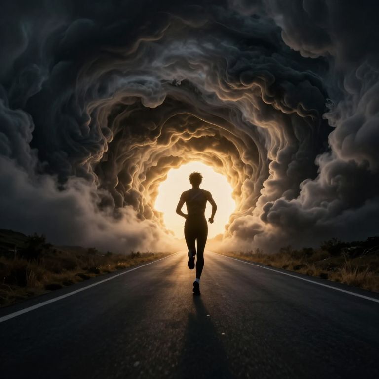 In the image, a person is running energetically down a road that leads through a dramatic, swirling tunnel of dark, billowing clouds. The tunnel's entrance is illuminated by a bright, golden light at the end, creating a stark contrast with the surrounding darkness. The runner, dressed in a sleek, form-fitting outfit, appears to be in motion, with their legs captured mid-stride, emphasizing the sense of speed and determination. The road itself is smooth and well-defined, guiding the viewer's eye towards the tunnel's opening. The overall composition is dynamic, with the runner positioned centrally, drawing attention to their forward momentum and the tunnel's imposing presence. The interplay of light and shadow, combined with the swirling clouds, adds a sense of depth and movement to the scene, creating a powerful visual metaphor for overcoming obstacles and pushing beyond limitations.