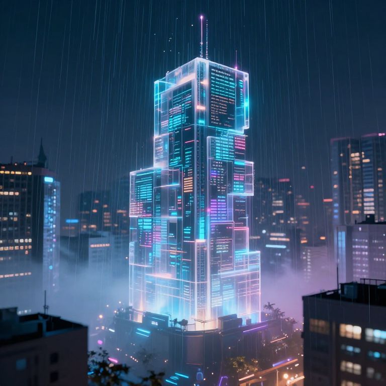 Neon-lit skyscraper with glowing blue and purple lights stands amid a rainy night cityscape, surrounded by fog and smaller buildings.