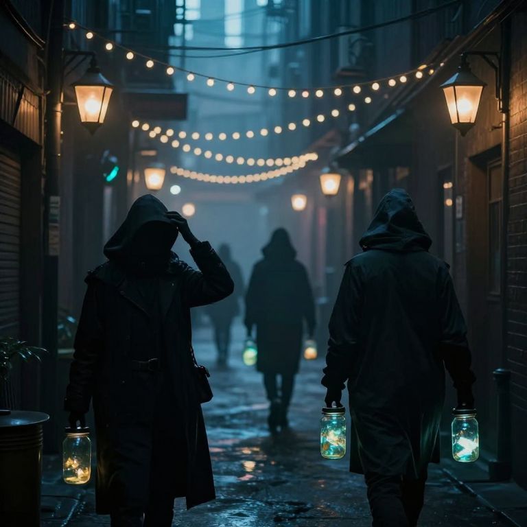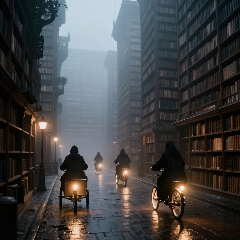 In a misty, otherworldly library street where towering bookshelves stretch endlessly into the fog, cloaked figures ride glowing tricycles, their luminous cargo casting an ethereal glow on the wet pavement below.