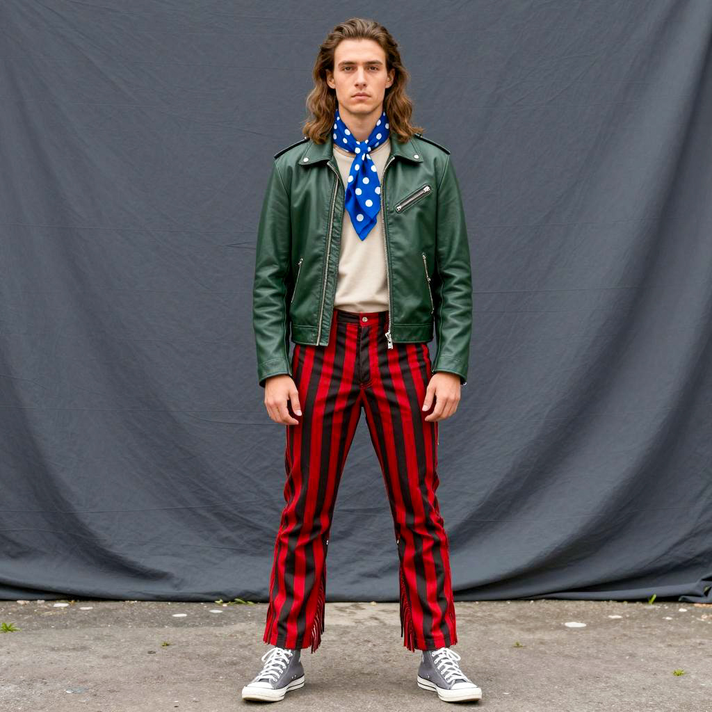 Band costume, photorealistic portrait of a young man with long brown hair, wearing a dark green leather jacket, blue and white polka dot scarf, beige shirt, red and black striped pants with fringe, gray high-top sneakers, standing in front of a dark gray fabric backdrop, daytime, natural light, confident expression, casual fashion style, full body shot, outdoor setting