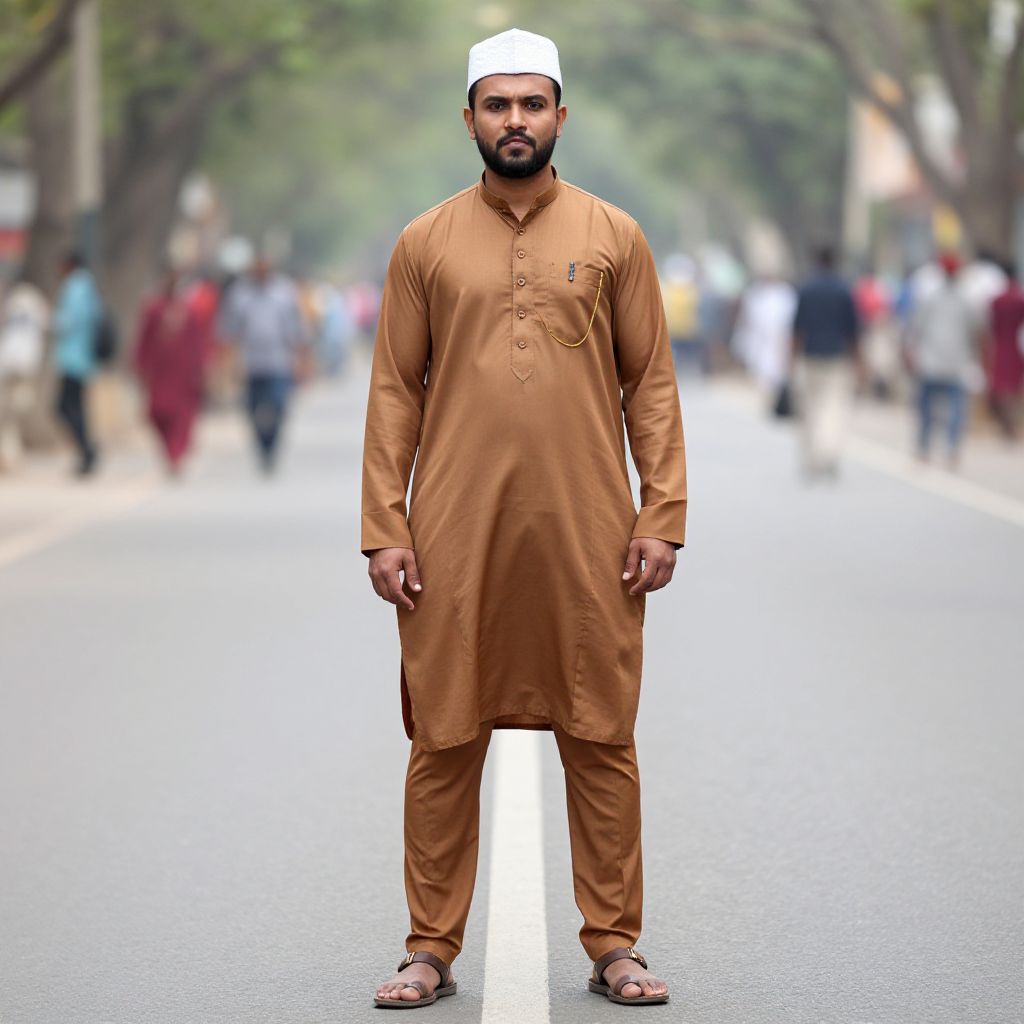 Photograph of a bearded South Asian man in traditional white sherwani with orange and green embroidery, hands on hips, wearing a matching turban