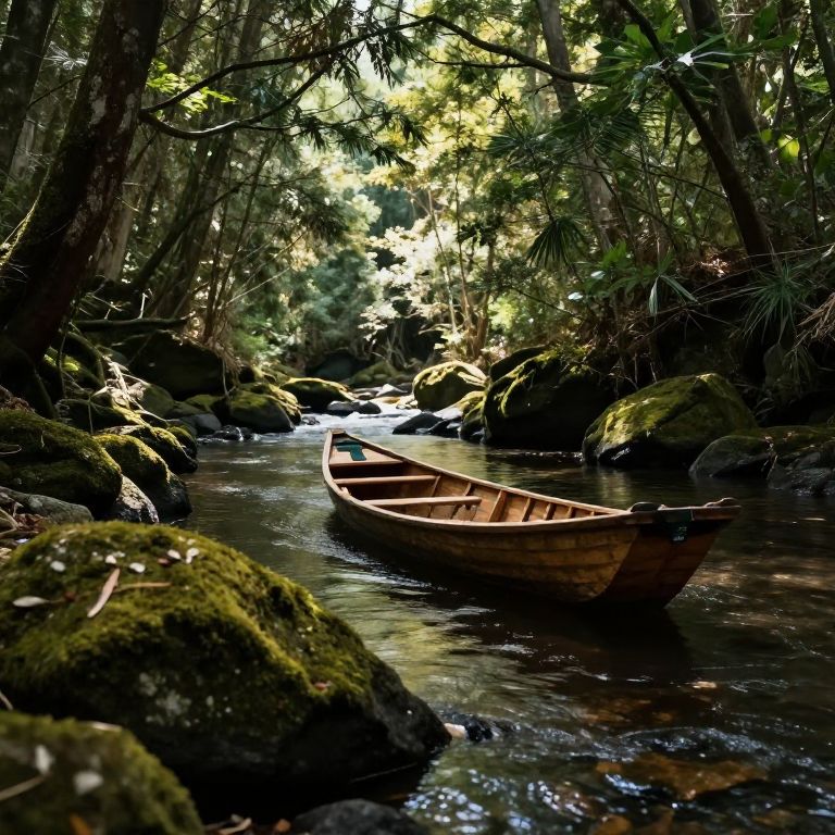 Handcrafted craftboat navigating through a narrow forest river, dappled sunlight filtering through dense foliage, moss-covered rocks along the banks, natural textures with earthy colors, sense of adventure and nature immersion, cinematic lighting.