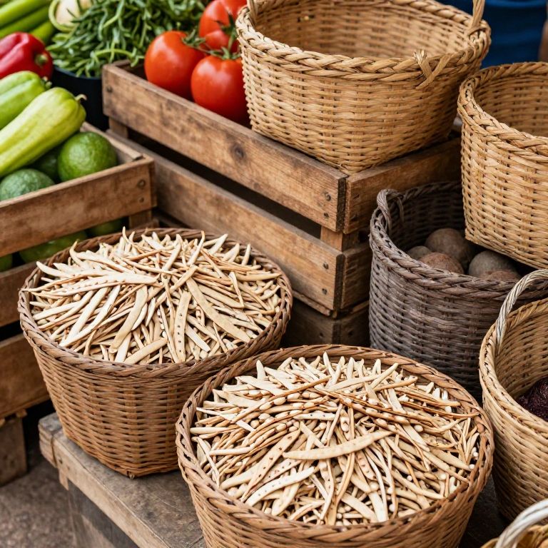 A vibrant photograph of a rustic market stall features woven baskets filled with dried, beige stalks. The baskets, varying in size, are stacked on wooden crates. Behind the baskets, there are wooden crates filled with fresh vegetables: red tomatoes, green cucumbers, and lime green bell peppers. A basket with potatoes is partially visible on the right. The wooden crates have a weathered texture, adding to the rustic charm. The background includes a hint of blue, suggesting an outdoor setting. The overall composition emphasizes natural, earthy colors and textures.