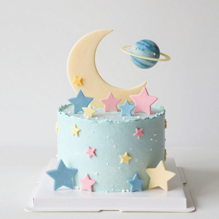 A whimsical celestial-themed cake adorned with pastel stars, crescent moons, and floating planets, inviting dreams of cosmic adventures.