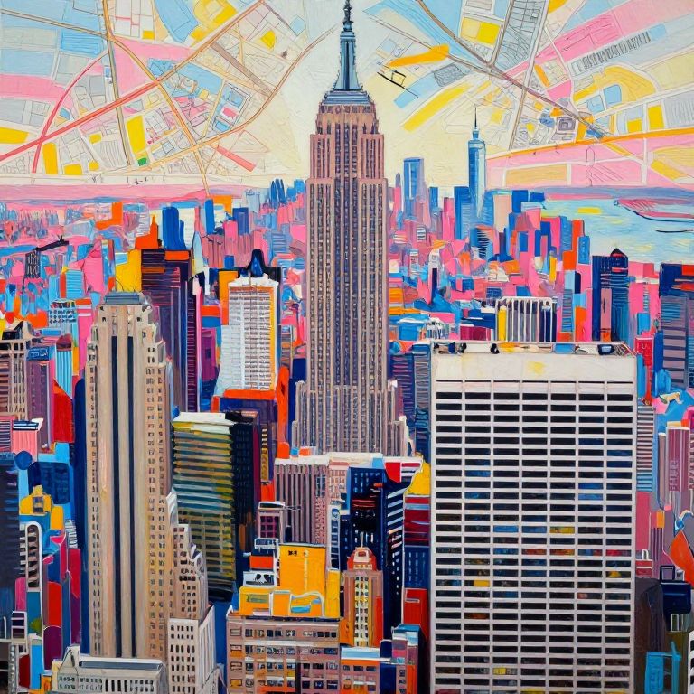 The image is an abstract artistic collage of New York City's landscape, featuring a vibrant and intricate depiction of the city's skyline. The composition includes the iconic Empire State Building, surrounded by other tall buildings, all rendered in a mix of bright, bold colors such as pink, blue, orange, and yellow. The city map is intricately detailed, with various streets and landmarks meticulously drawn. The artwork is created using dry acrylic paint, which gives it a textured, layered appearance. Black pen lines are used to enhance the details and add depth to the scene. The overall composition is dynamic, with elements arranged in a way that creates a sense of depth and perspective, as if the viewer is looking at the city from a distance. The interplay of colors and textures adds to the visual richness of the image, making it a striking representation of New York City's urban landscape.
