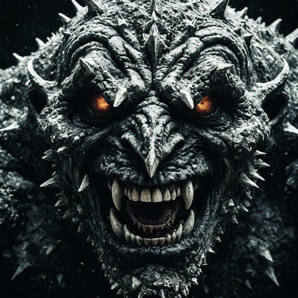 Close-up of a surreal, amorphous giant creature with cracked, textured skin covered in sharp crystalline spikes. The monstrous face features glowing orange eyes, multiple jagged teeth, and an aggressive expression, emphasizing a nightmarish and unsettling design.