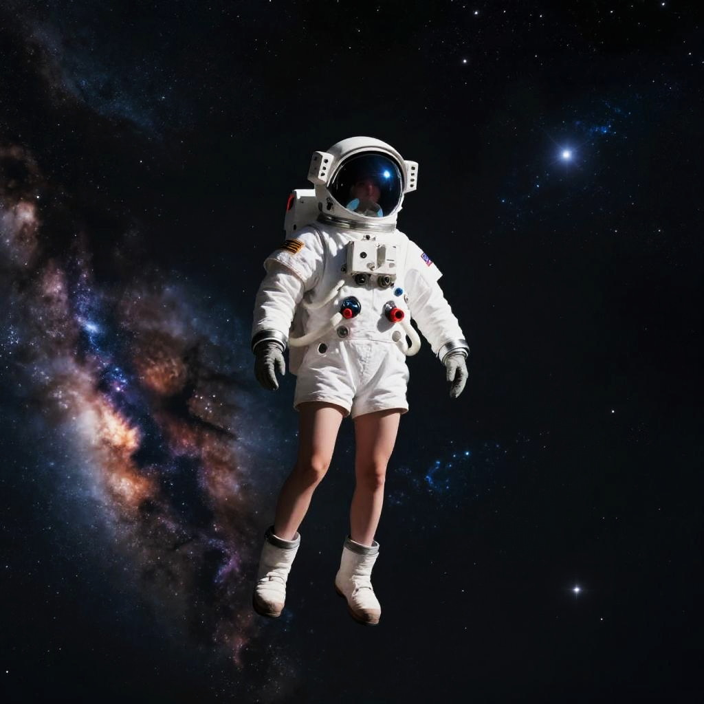 Photograph of a blonde woman in a white astronaut suit floating in space, Earth below, with a planet in the background.