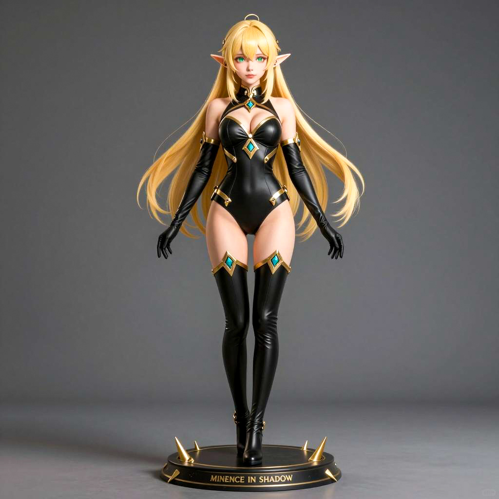 Blonde elf woman, anime style, standing on a pedestal. She has long hair, pointed ears, green eyes, and wears a black, gold-accented bodysuit with thigh-high boots and gloves. Her bodysuit has a deep cleavage cutout. She has large breasts, a slim waist, and wide hips. She stands with her arms slightly out to the sides, legs together. The pedestal has a dark, ured base with gold spikes. She looks forward with a neutral expression. The word "MINENCE IN SHADOW" is on the pedestal base.