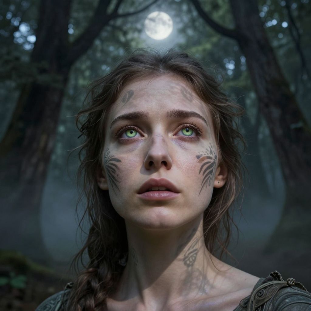 A hauntingly beautiful portrait captures an Eastern European woman with captivating green eyes and porcelain skin from a unique 'bug's-eye view' perspective. Set against swirling mist and ancient trees, her intricate tribal markings blend seamlessly into the mystical forest, suggesting she is an ethereal guardian watching over it. Soft moonlight filters through the canopy above, casting dancing shadows across her delicate features, revealing an expression of wisdom and sorrow that echoes timeless stories whispered by the ancient trees themselves.