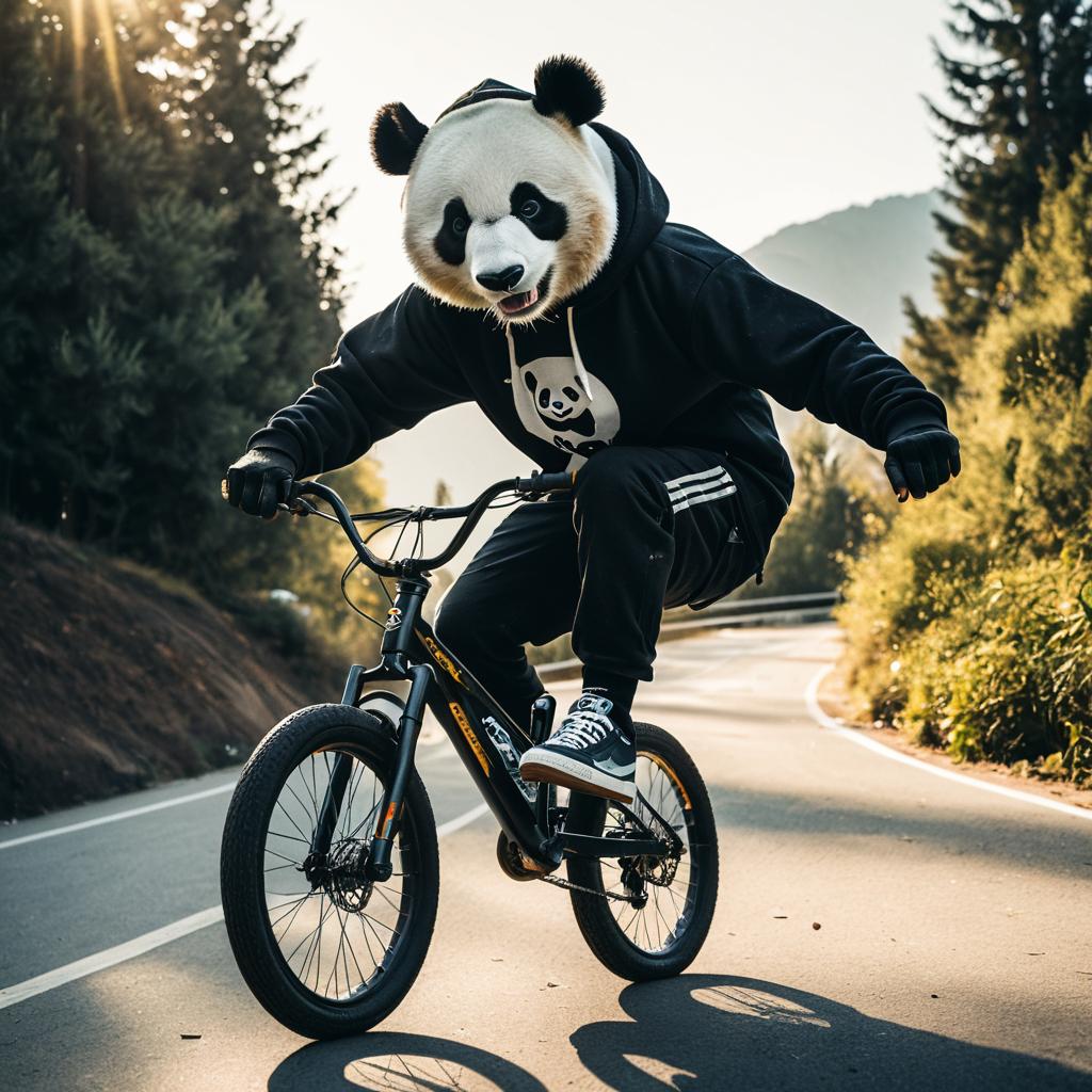 Realistic depiction of a skateboarding panda, riding a mountain bike, realistic style, streetwear hoodie and sneakers, joyful expression, urban background, late afternoon lighting.