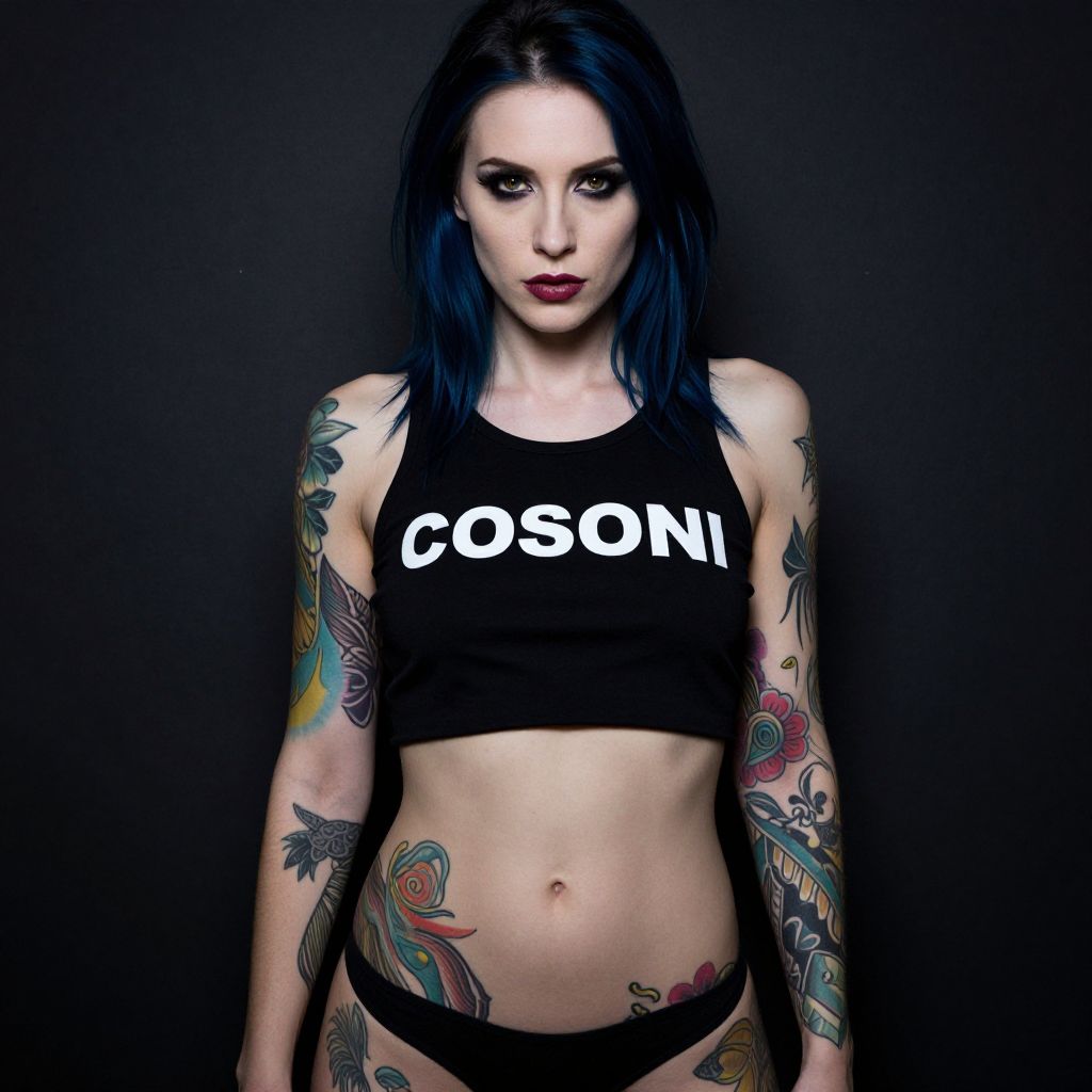 Photograph of a pale-skinned woman with dark blue hair and intense, dark eye makeup. She's wearing a black crop top with "COSONI" in white letters and black panties. Her arms and torso are covered in colorful, detailed tattoos. She stands against a dark background, looking directly at the camera with a serious expression. The lighting is moody and dramatic.
