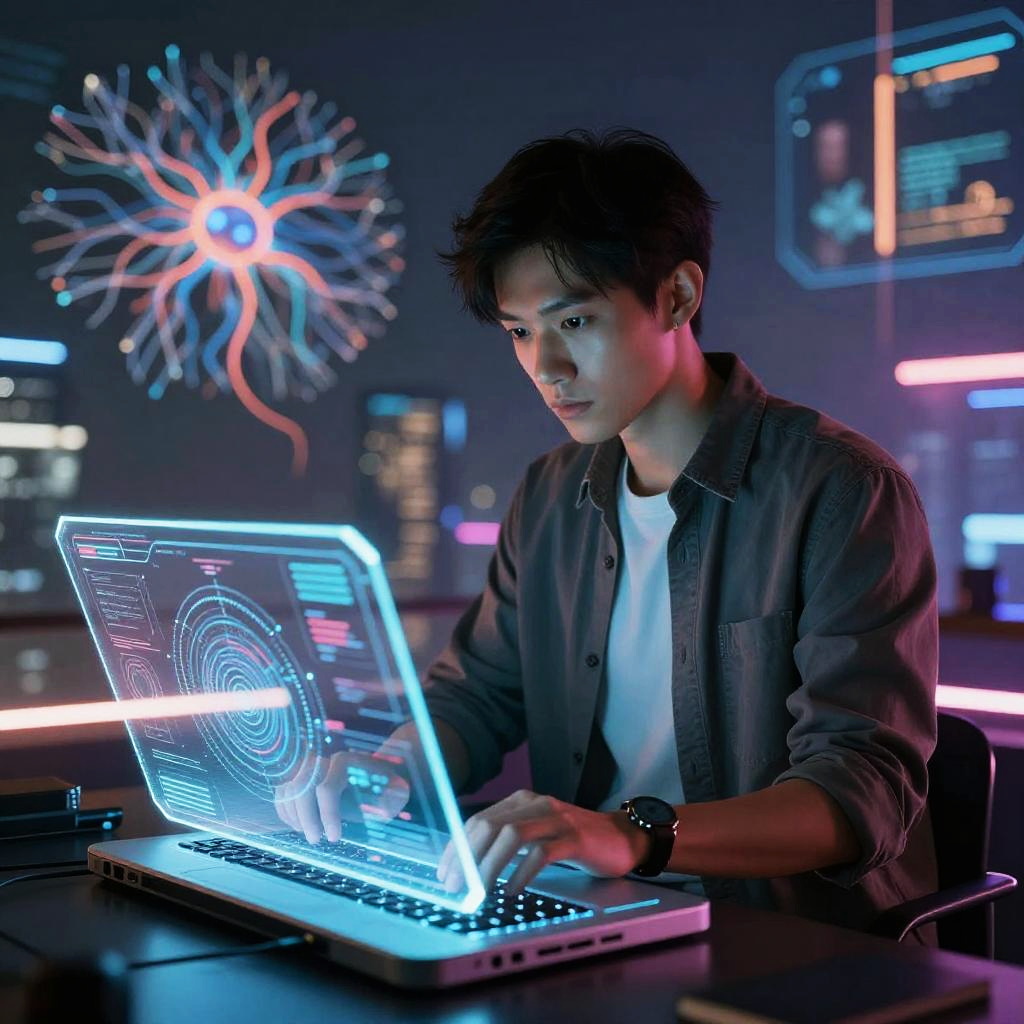 Realistic photo.a young scientist, wearing a lab coat with high-tech gear, holding a holographic projector, in a futuristic laboratory, rendered in the tense and sci-fi-heavy style of Hiroya Oku. realistic photo